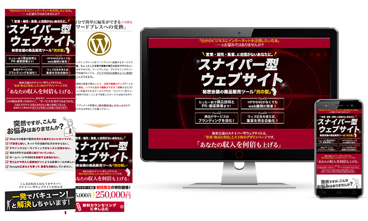 LPをスナイパー型ウェブサイトという言葉に置き換えて、ビジュアルでの連想やインパクト重視のページ構成に。
